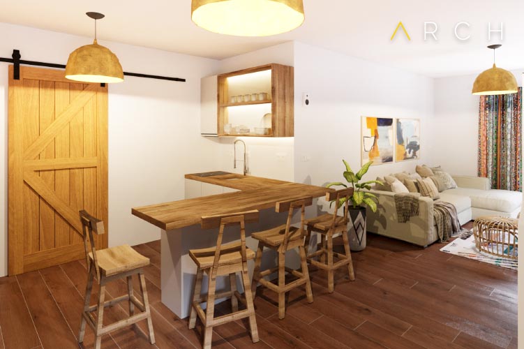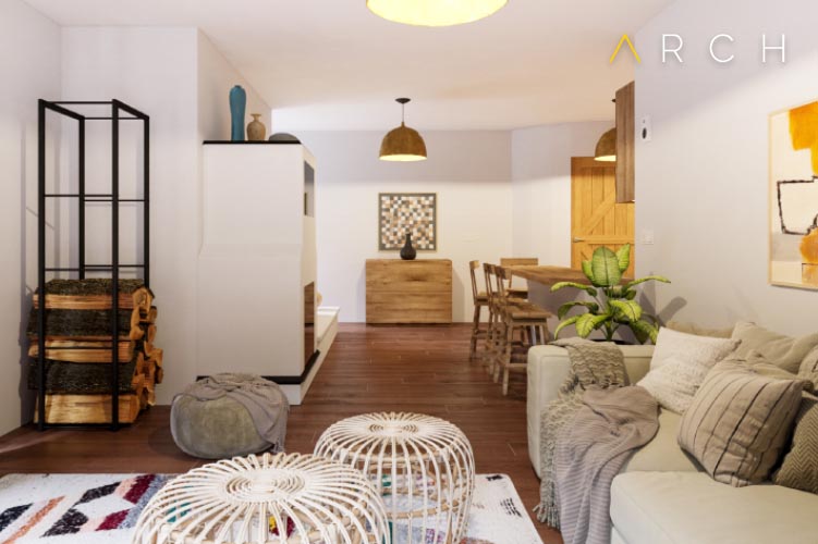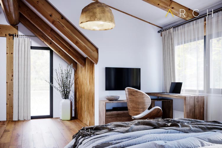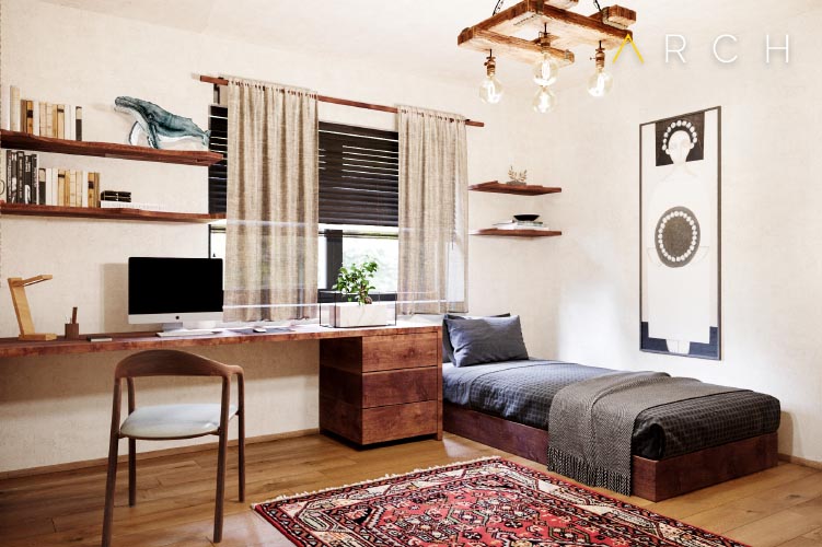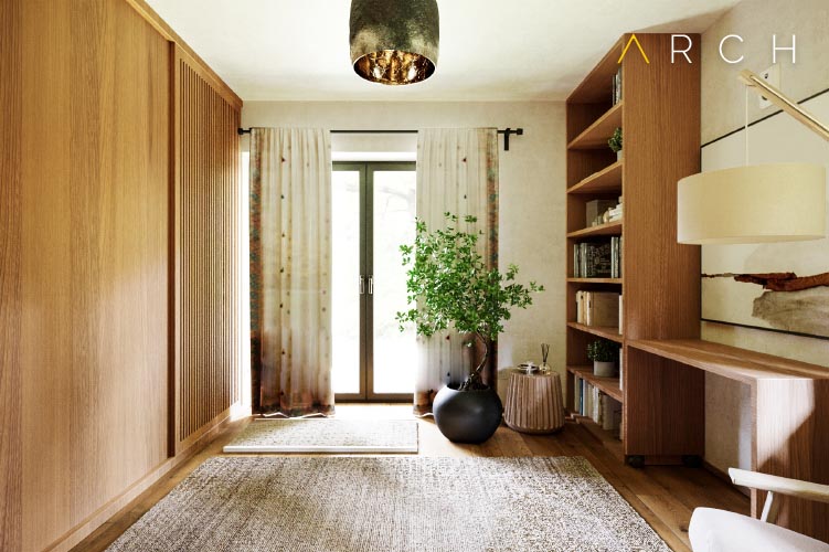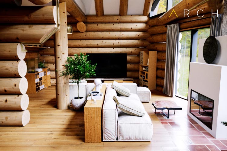Заказчику на выбор было предложено несколько эскизов — вариантов оформления интерьер в стиле ваби-саби. Данный стиль подразумевает простоту решений, подчеркивает красоту и естественность предметов интерьера, без лишних украшений и излишеств. Наши дизайнеры старались подчеркнуть естественную притягательность деревянных элементов в интерьере — колонн, балок, стен, дополнив помещения интересными предметами декора. Именно на таких декоративных элементах в доме делаются акценты, они приковывают к себе внимание, подчеркивают интерьер в стиле ваби-саби. Во всех помещениях — это простая и комфортная мебель, преимущественно из дерева, яркие интересные светильники из меди, керамики, необычные статуэтки, картины на стенах, домашние растения. Интерьер получился целостным и завершенным, простым и уютным, дизайнеры смогли объединить все элементы интерьера воедино и при этом выполнить весь интерьер в стиле ваби-саби.