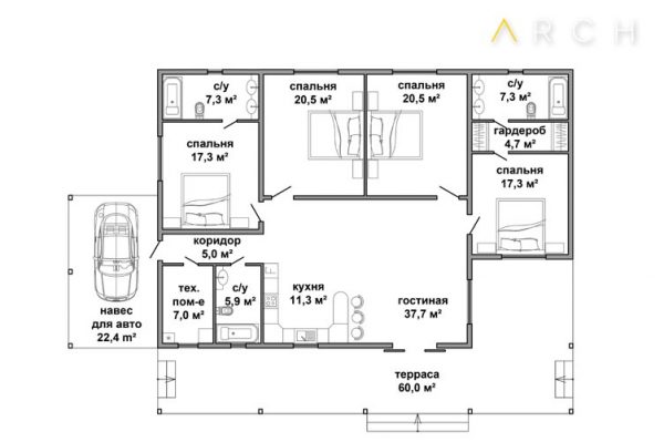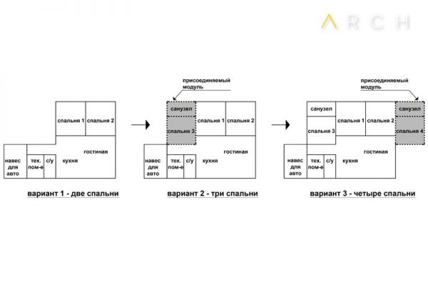 Проект одноэтажного каркасного дома, выполненный по модульной технологии. Этот дом может «расти» вместе с вашей семьей, что позволяет вам вначале построить дом с двумя спальнями, а при желании пристроить еще одну или две спальни.