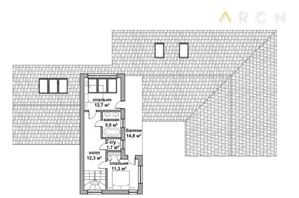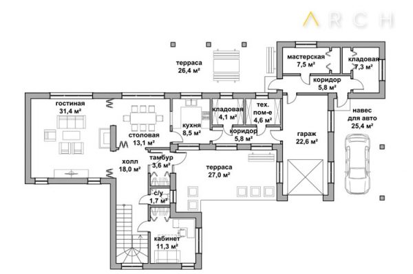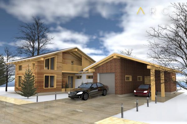 Проект одноэтажного дома с мансардой из блоков с комбинированной отделкой кирпичом, деревом и штукатуркой.